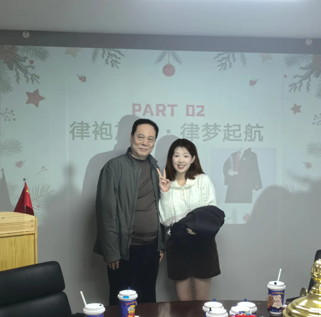 接待大厅的圣诞树,为严肃的律政空间注入了一抹活泼的绿意;实习律师刘梓希身着盛装,一顶圣诞红帽,让人联想到冰雪世界的圣洁;签到板上的趣味涂鸦,成了合影留念的“限定背景”;大家头戴圣诞发饰,律所瞬间变身“圣诞派对现场”。总所管委会主任郑新平亲自为转正律师颜嫔萍授袍,这份传承与新鲜力量的注入,让聚会更添一份庄重与希望。